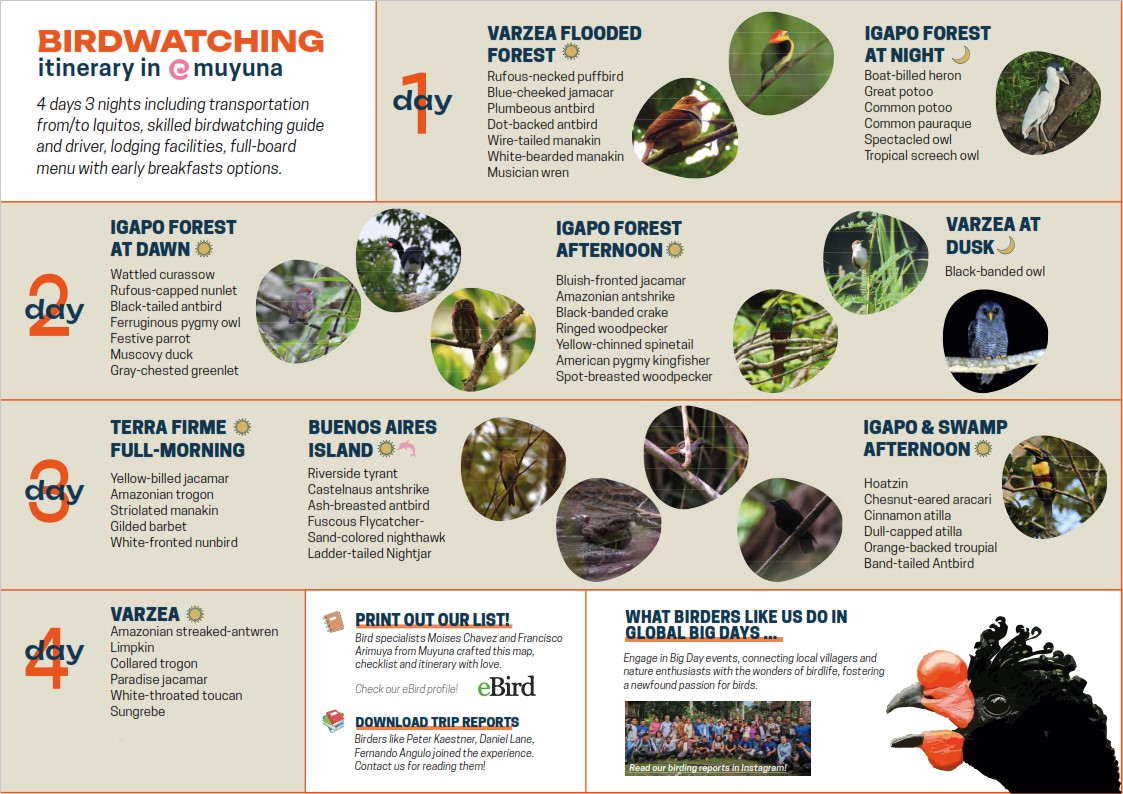 The Peruvian Amazon groups together more than 2,000 species of birds and some 250 aquatic species. Although it is a large number, it increases seasonally with the migratory birds of Patagonia and North America. For this reason, in Muyuna we thought it was necessary to give it the importance it deserves, making a special program to observe birds and learn their customs, told by expert guides from the area. There is no other paradise in the whole world like the one around the Amazon River, especially for those who love bird watching. The most important and emblematic bird in the area of Muyuna is the Wattled Curassow (Crax globulosa). It is an Amazonian bird in critical danger of extinction, which sighting motivates birdwatchers to travel from all around the globe to observe this majestic bird. Peter Kaestner, among the top-5 Ornithologists on the planet according to ebird.org, recommend this package.