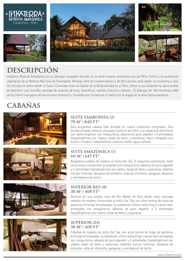 Un albergue de lujo ecológico frente al río Madre de Dios, Inkaterra Reserva Amazónica tiene 35 cabañas de madera inspiradas en la cultura Ese’Eja. 540 especies de aves han sido registradas dentro de la propiedad, en el corazón del bosque lluvioso.