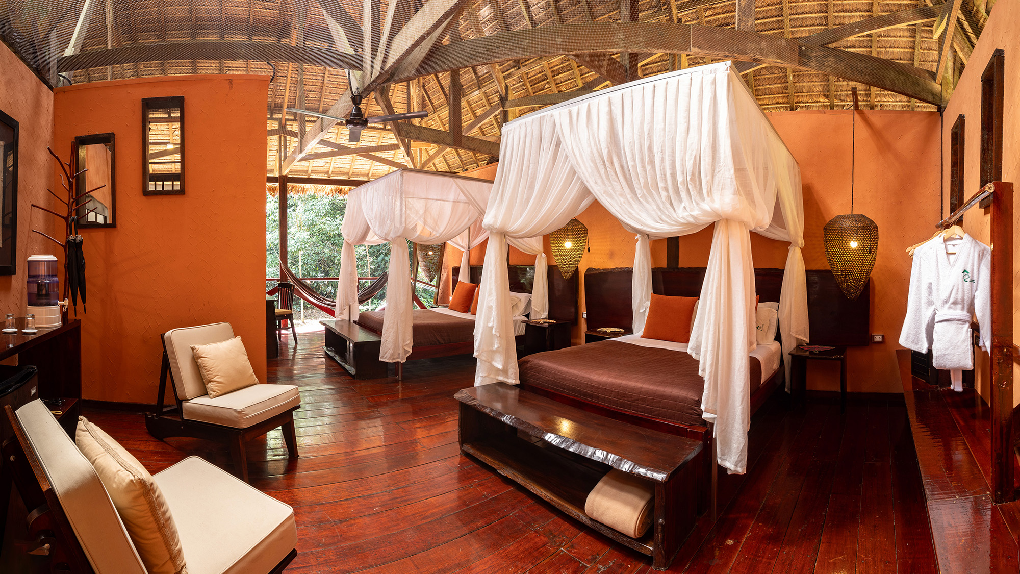 Enjoy the open wall facing the Amazon rainforest and awake with jungle sounds in the morning. Our room rates include all land and river transportation to/from Puerto Maldonado to the lodge thru our fixed departure shuttle service, guided activities in group, all meals, and accommodation.